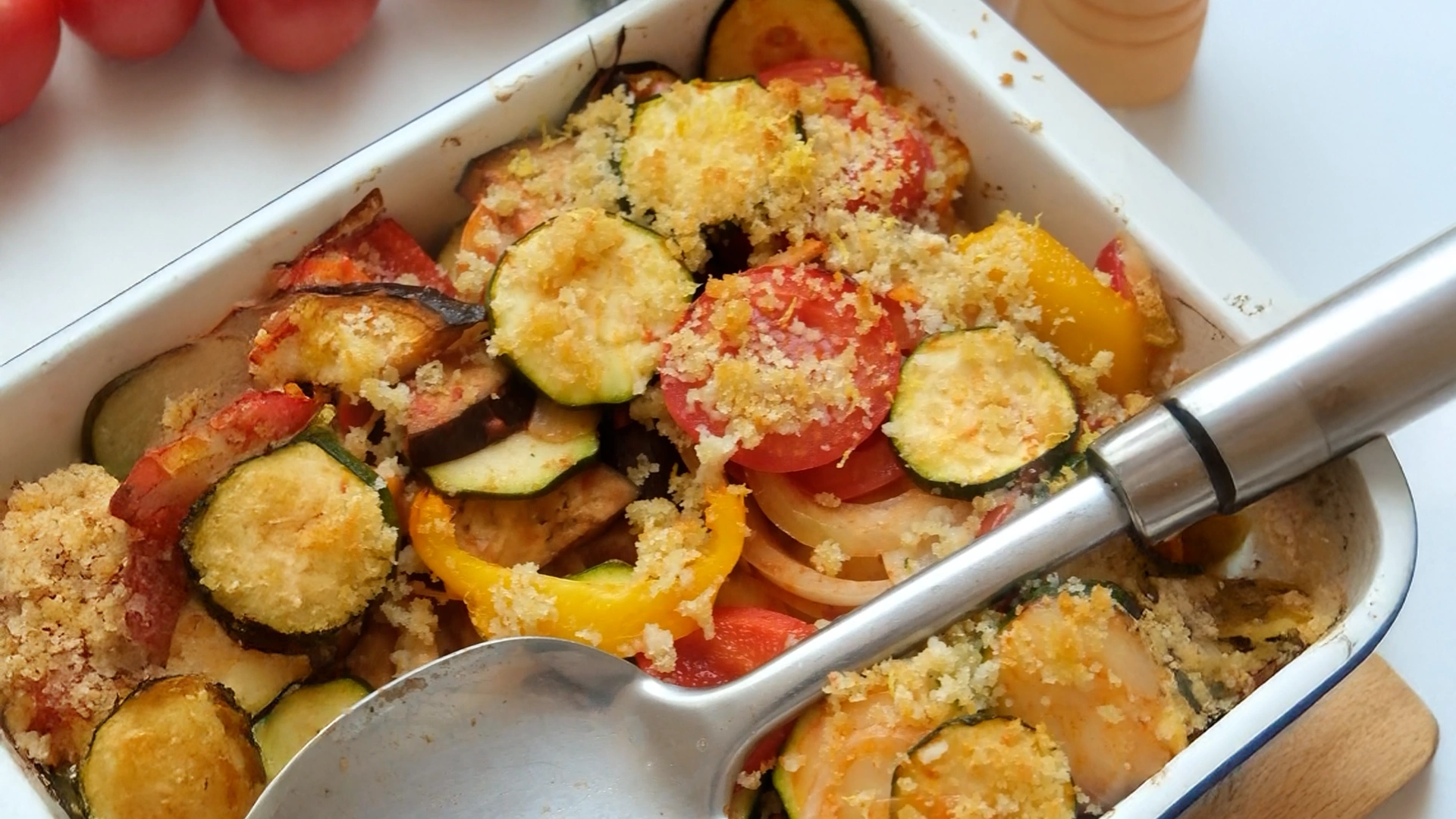 Golden breadcrumbs crown this rustic ratatouille, adding a savoury crunch to the medley of vegetables beneath. Juicy courgettes, sweet peppers, and tender tomatoes meld together in a herby tomato sauce, while the toasted crust invites you to relish each flavour-packed bite.
